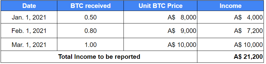 For example, Sam runs a couple of mining machines in his dorm room. He received 0.01 BTC on January 1, 2022 (worth A$10,000 at the time). On May 15, 2022, he sold this 0.01 BTC for A$2,000.