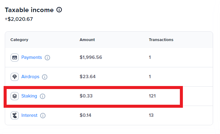 Once you connect your exchanges and wallets to CoinTracker, it can detect staking rewards and aggregate the amount under the “Staking” line on the “Taxable Income” card.