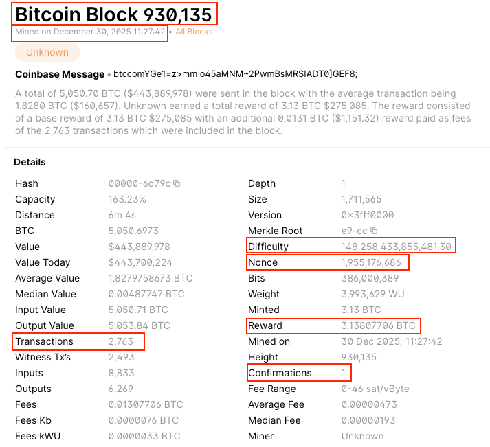 Bitcoin block 930,135 was mined on December 30, 2025, and it includes 2,763 transactions. All of those transactions are represented in the Merkle root shown in the block header.