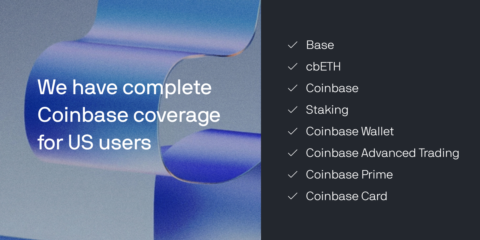 CoinTracker supports the entire range of Coinbase products, including Base, cbETH, Coinbase Wallet, Coinbase Smart Wallets, Coinbase Advanced Trading, Coinbase Prime, and Coinbase Card. With tax support in the US, Canada, the UK, and Australia, we make it easy to stay compliant with crypto tax regulations. As part of our partnership, we’re committed to supporting every new feature Coinbase launches—quickly and seamlessly.