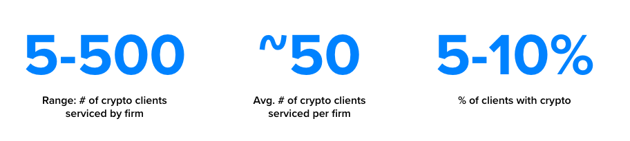 We’ve worked with firms of all sizes. Here are some quick data points on their crypto practice dynamics: