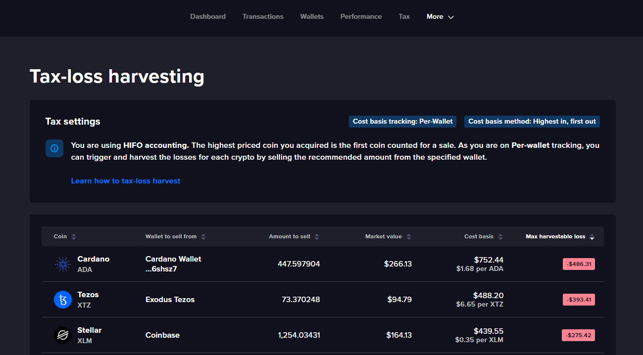 - Tax-loss-harvesting: With CoinTracker’s tax loss harvesting dashboard it is simple to identify tax loss opportunities, the amount to sell and the wallet to sell from.