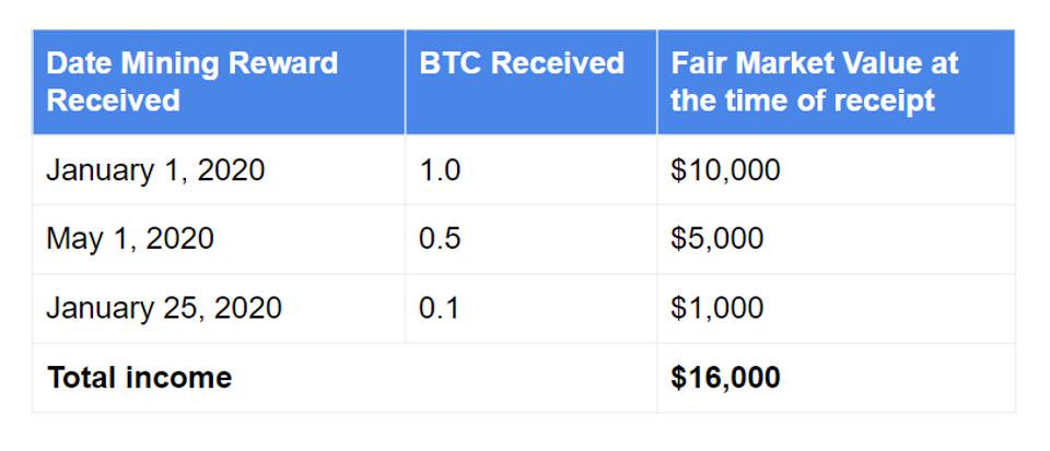 For example, assume David receives the following Bitcoin (BTC) mining rewards on the corresponding days. His total ordinary income from the mining operation for the month of January would be $16,000.