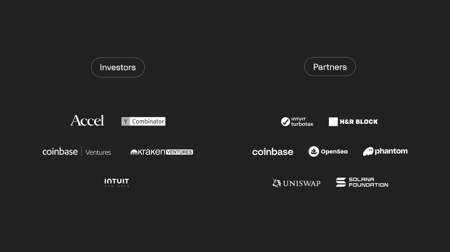 - Strategic partnerships with TurboTax, H&R Block, Coinbase, OpenSea, Phantom, Solana Foundation, Uniswap
