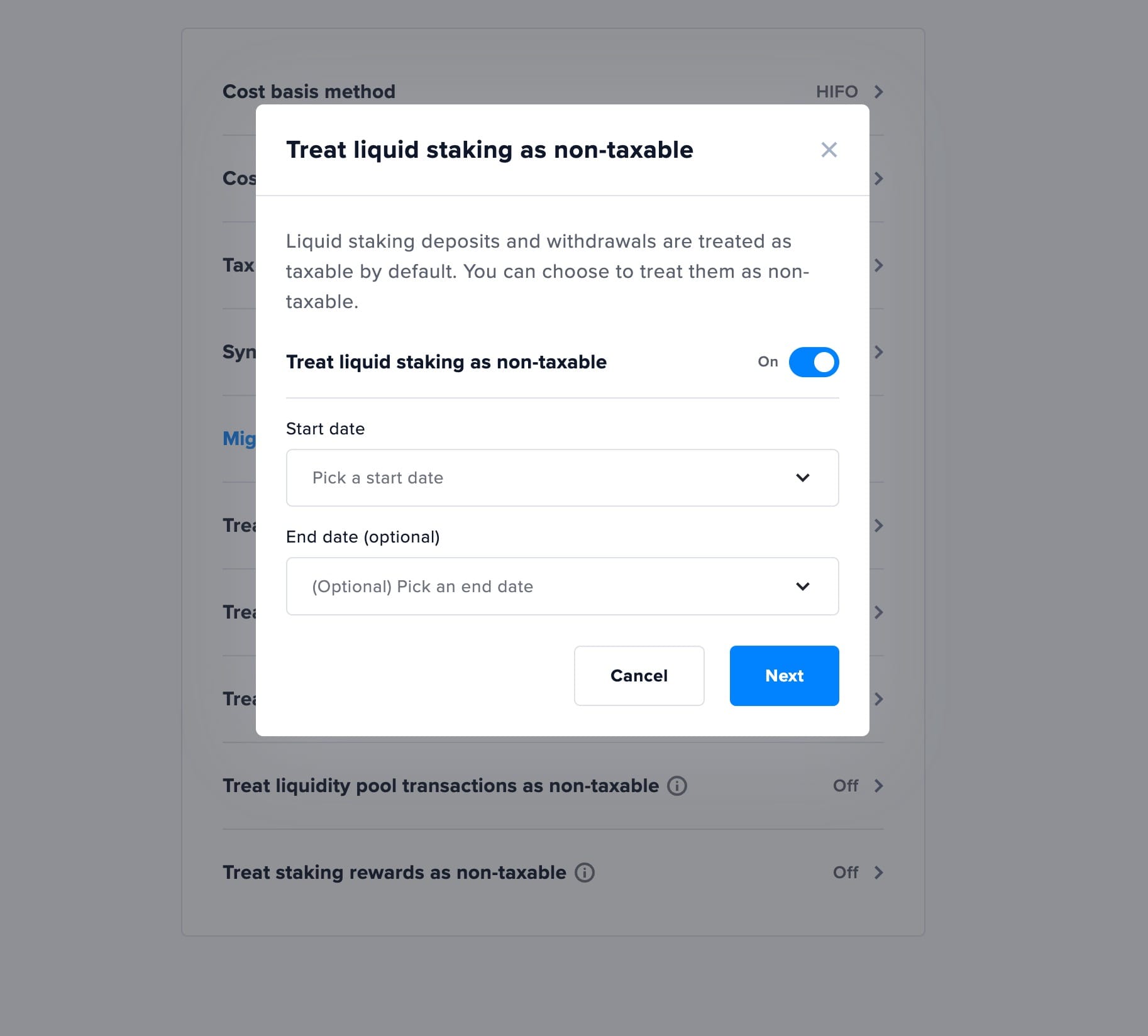 You can set rules to treat wrapping, liquid staking, liquidity pool, and lending transactions as non-taxable (except if you’re in the UK). Regulations on how to tax them are ambiguous and vary by country, so consult your tax professional before changing default tax treatments.