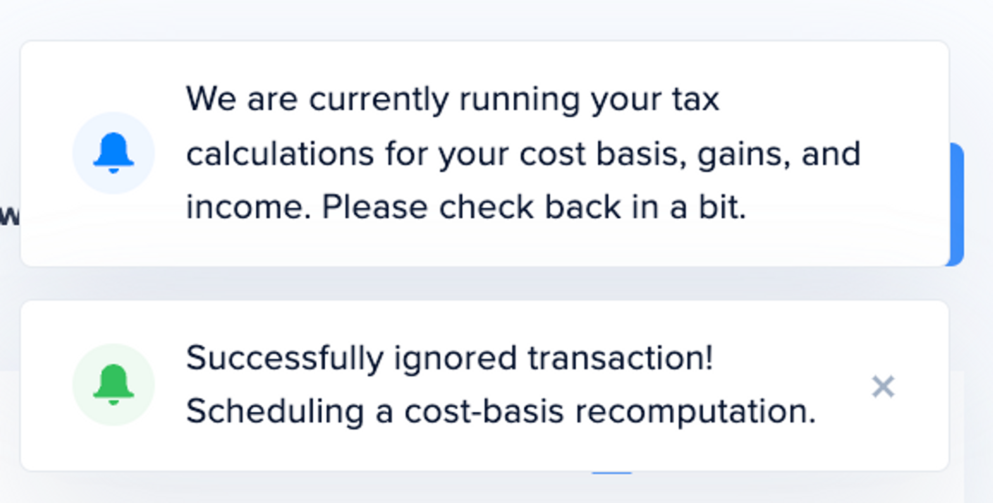 When you make a change to your transactions, CoinTracker runs our accounting engine, so you have the most up-to-date cost basis, gains, and income calculations. We have launched a new feature that makes it clear when those tax calculations are running as you’re browsing your transactions.