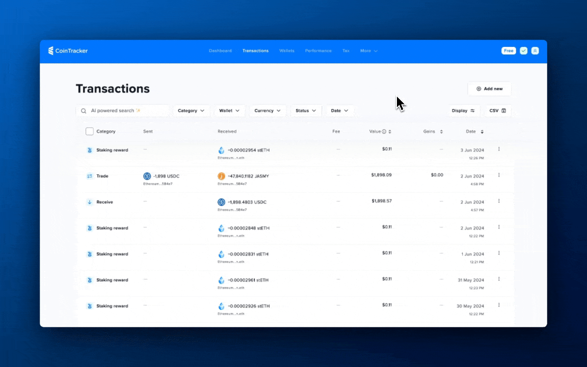 We love staking rewards, but we don’t love seeing them take up the whole transactions page. CoinTracker now has the ability to hide your staking rewards, so you can see a more focused view of your transactions. This setting will stick around even if you leave the app and come back later.