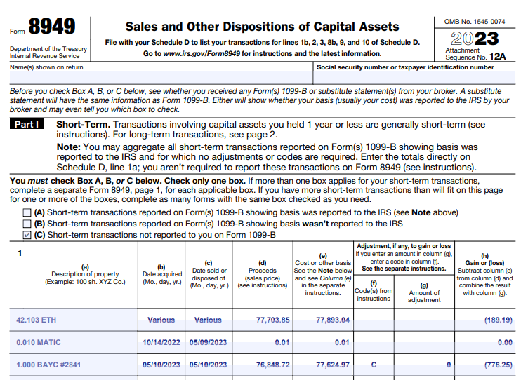 Hobbyist creators and investors can use IRS Form 8949 and Schedule D to report NFT minting gains/losses and NFT trades. Make sure to enter code “C” in column (f) to indicate that you sold an NFT which is treated as a collectible.