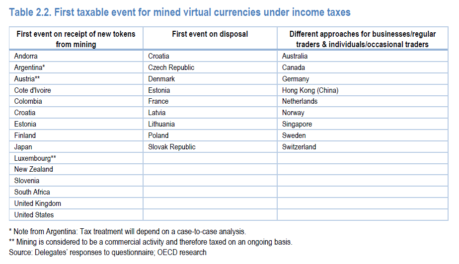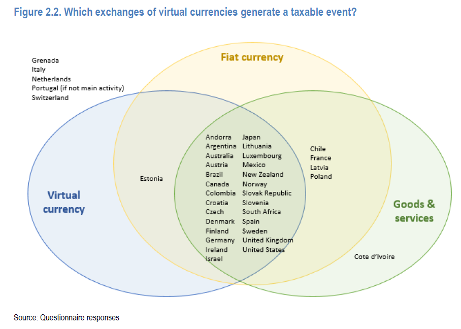 While a small number of countries (Grenada, Italy, the Netherlands, Portugal, Switzerland) don’t consider any exchanges made by individuals to be taxable events, the majority of countries in the OECD impose taxes on crypto-to-fiat trades, purchase of goods and service thru crypto, and crypto-to-crypto trades.