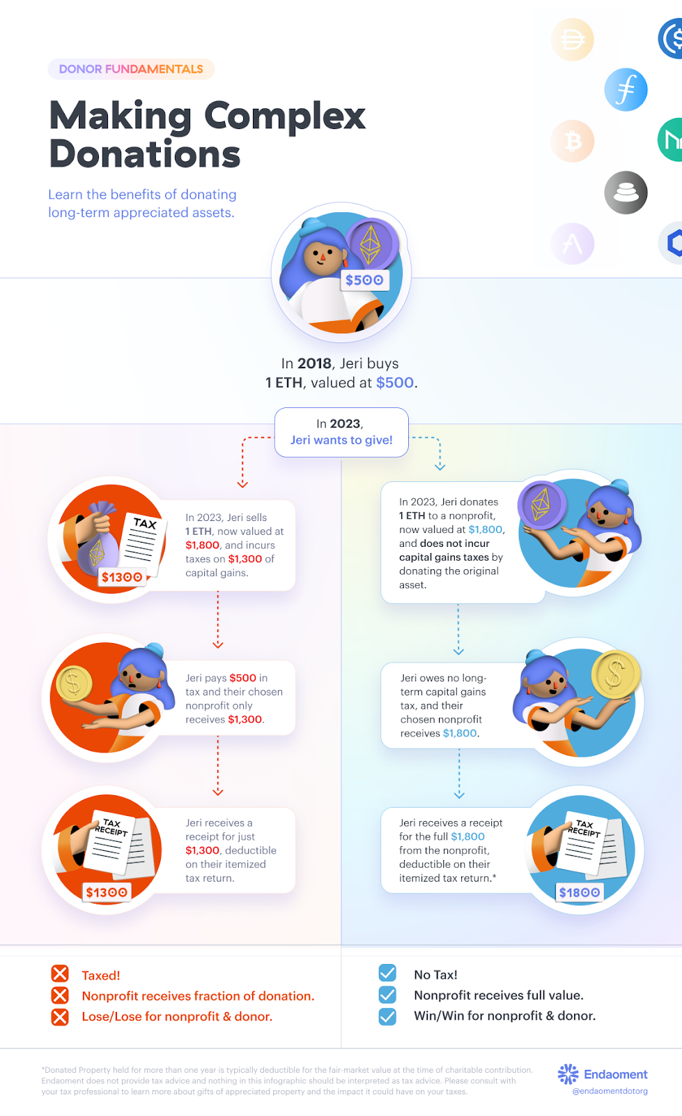 B) They can send the assets directly to a 501(c)(3) organization like Endaoment. If they choose this option, since the artist never recognized the income, doesn’t owe taxes, and doesn’t claim a charitable deduction. However, if the charity auctions the NFT(s) at a charity auction, the purchaser may be able to claim a deduction.