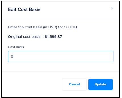 However, If you want to take this aggressive approach in CoinTracker, you can edit the cost basis to $0 and not report the staking rewards on the Transactions page as income when you file your tax return. If you take this aggressive approach, you wouldn’t report any ordinary income on Schedule 1. You will only pay capital gains tax when you sell your staking rewards. As an example, you have one ETH of staking rewards. When you sell it, the fair market value (FMV) is $2,000. You will have a $2,000 capital gain ($2,000 - $0 = $2,000).